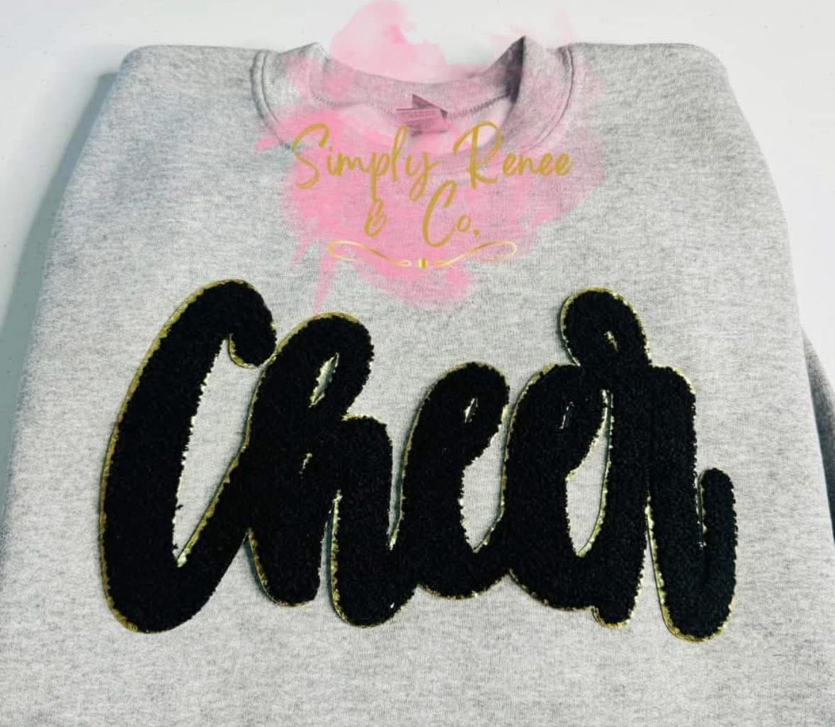 Chenille patch sweatshirt. Stay warm and show team spirit in our Chinelle patch Cheer Sweatshirt. Perfect for coaches, cheerleaders, and proud moms. Made with high-quality material for long-lasting wear. Be the ultimate cheer supporter and stay cozy with our Cheer Sweatshirt.