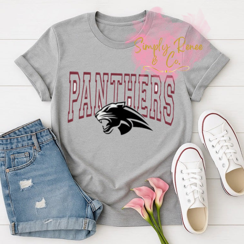 - Design: Panthers text in maroon outlined block letters with black panther mascot