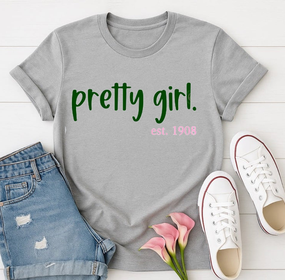 Celebrate timeless beauty, strength, and sisterhood with our Pretty Girl! Est. 1908 Tee 💕💚. This soft and stylish gray tee is designed with bold green lettering and a touch of pink accent to honor legacy, pride, and culture. Perfect for casual wear, events, or pairing with your favorite denim and sneakers for an effortlessly chic look.